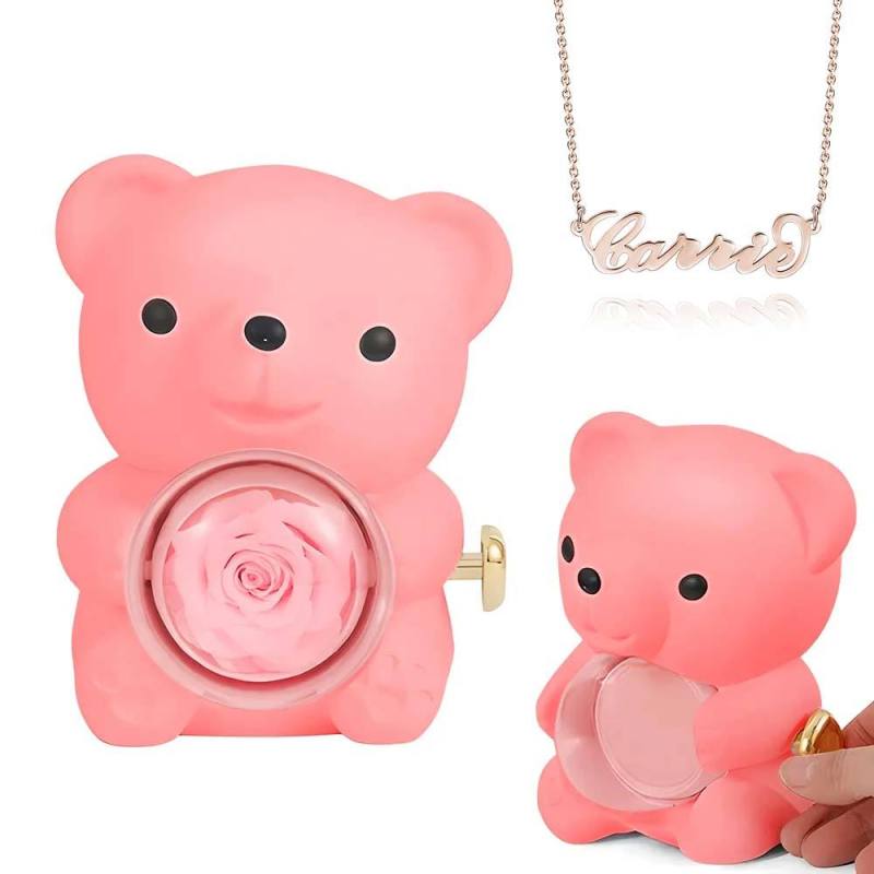 قلادة اسم مخصص مع صندوق هدايا الدب الوردي الحقيقي صندوق هدايا على شكل قلادة صندوق هدايا مجوهرات