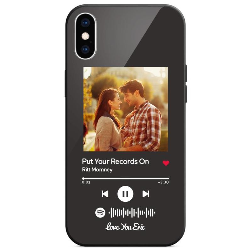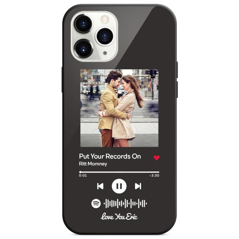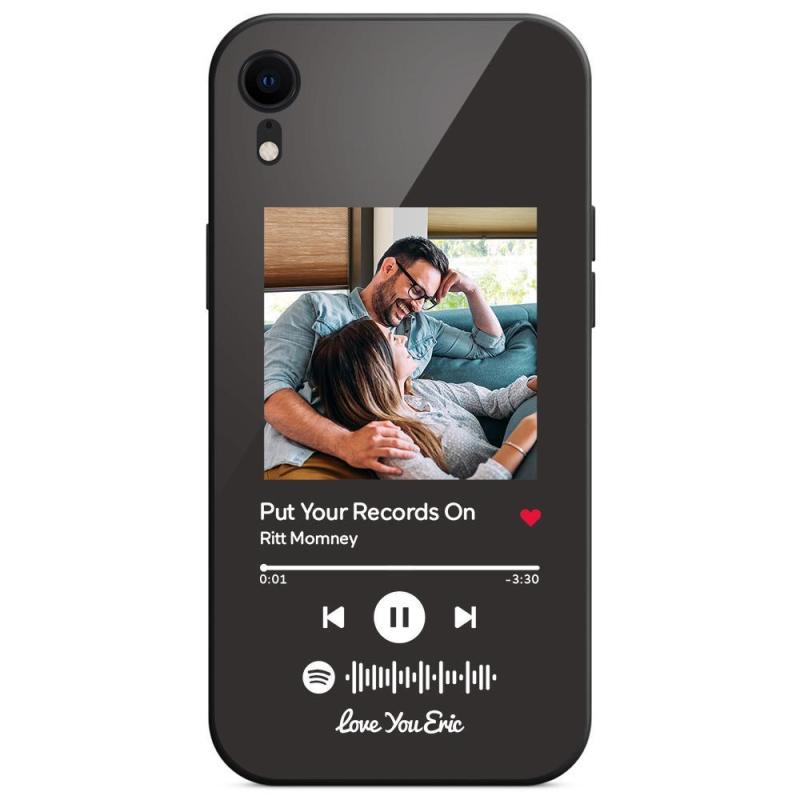 جراب iPhone مخصص لموسيقى Spotify مع نص قابل للمسح وأغنية موسيقية مخصصة محفورة من الزجاج المقوى - أسود