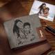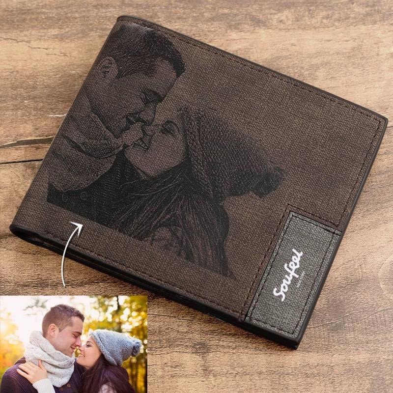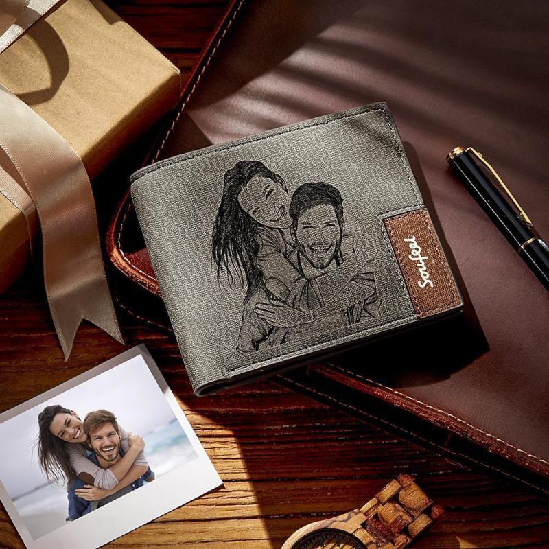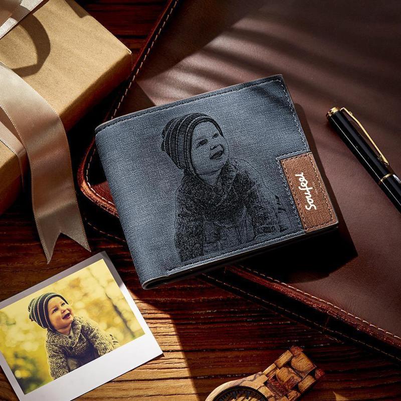 محفظة رجالية ثنائية الطي محفور عليها صورة مخصصة - هدية جلدية رمادية للعائلة